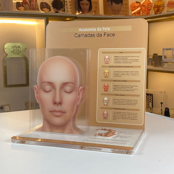 Este display anatômico em formato compacto e visual apresenta, de forma clara e objetiva, as principais camadas da face humana, ideal para exposição em ambientes clínicos, educacionais e demonstrativos.