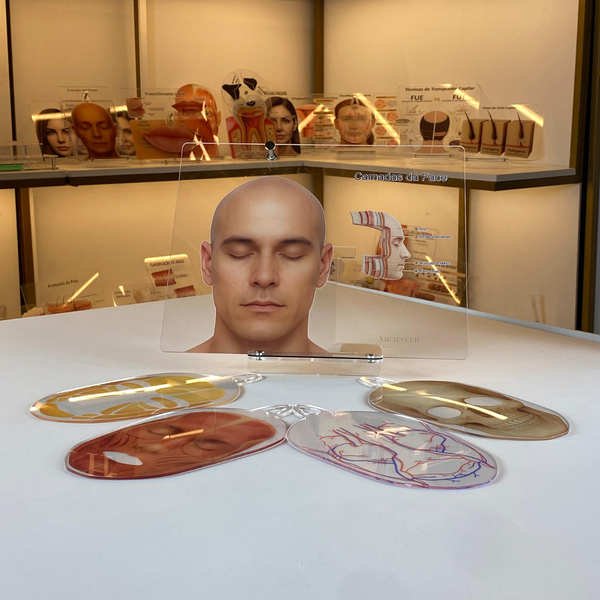 Este modelo anatômico ampliado representa, em cortes detalhados e didáticos, as principais camadas da face humana, permitindo a compreensão clara da organização dos planos faciais.