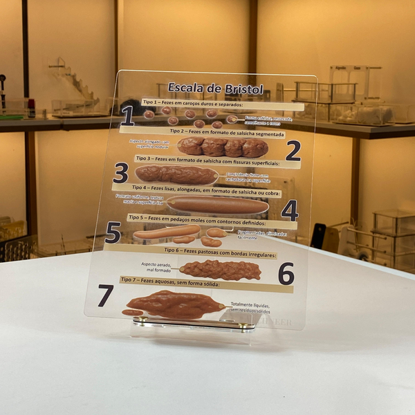 Este modelo anatômico ampliado apresenta de forma clara e comparativa os sete tipos de fezes descritos na Escala de Bristol, usada mundialmente para avaliar o trânsito intestinal e a consistência fecal.